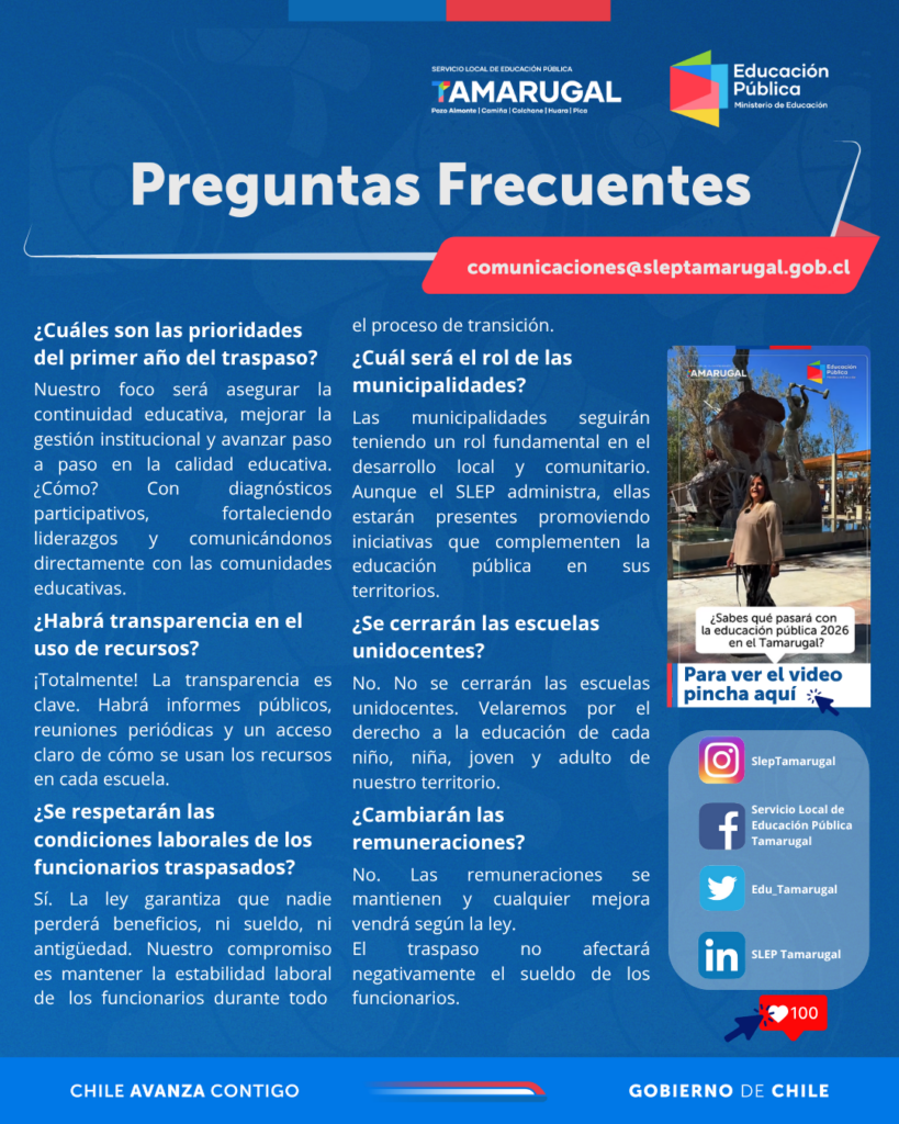 Dirección educación públicaMineducServicio Local de Educación Pública del Tamarugal ACÁ TENEMOS MÁS RESPUESTAS A SUS PREGUNTAS FRECUENTES: